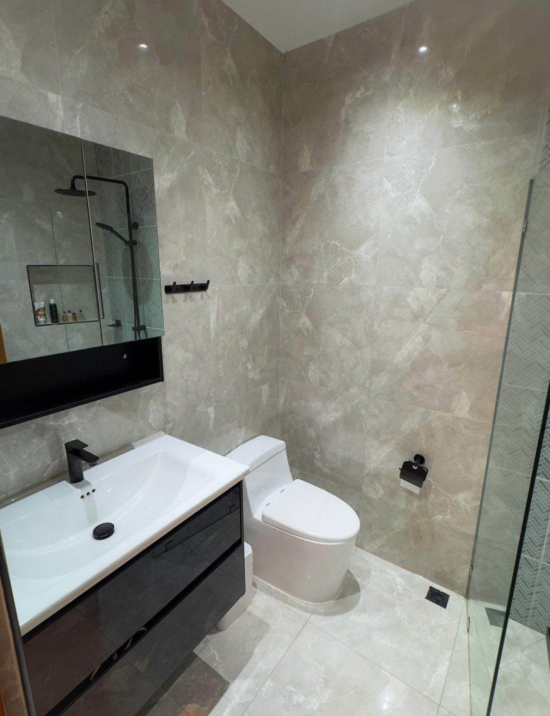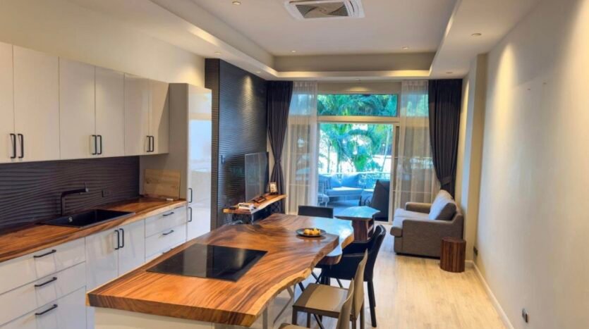 The complex offers a gym, swimming pool, and tennis court, with restaurants, the beach, bakeries, cafés, and a night market all within walking distance.