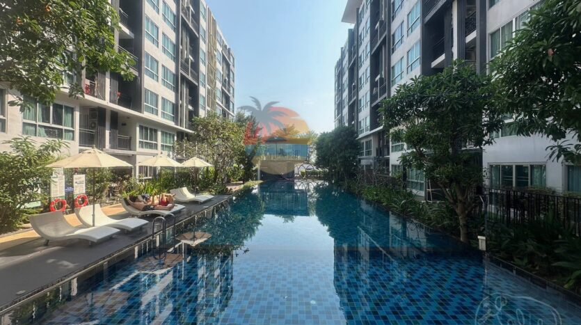 Natureza Art North Pattaya, a condominium project completed in 2014 by N.C. Housing, located on Chaiyapruek Road near Sukhumvit Road in North Pattaya, Chonburi Province. It consists of two low-rise buildings, 8 stories high, with 406 units. Highlights: “Community in the Park” style design with large green and open spaces, a swimming pool, relaxation gardens, and other complete facilities. This room is 2 bedrooms 2 bathrooms with City view. Floor 7th. Fully furnished.