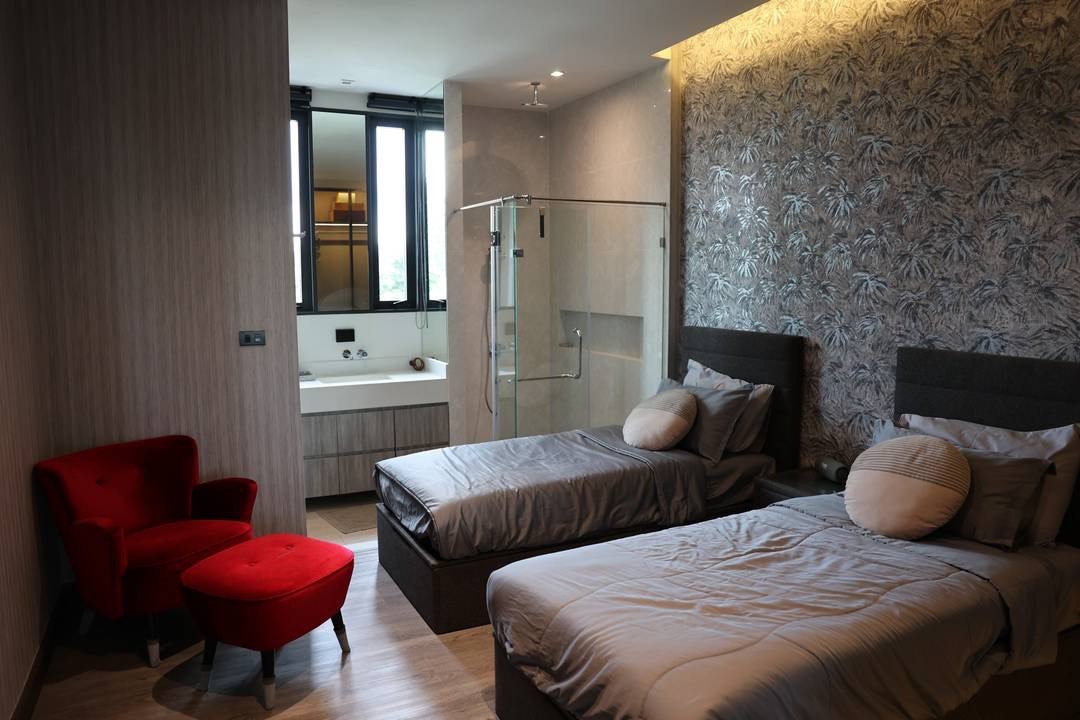 It has 4 bedrooms, including a master bedroom and an extra-large master bedroom. There will be 2 king-size beds (6 feet), 5 bathrooms, 1 kitchen, 1 living room, 2 storage rooms. The house was completed last April.