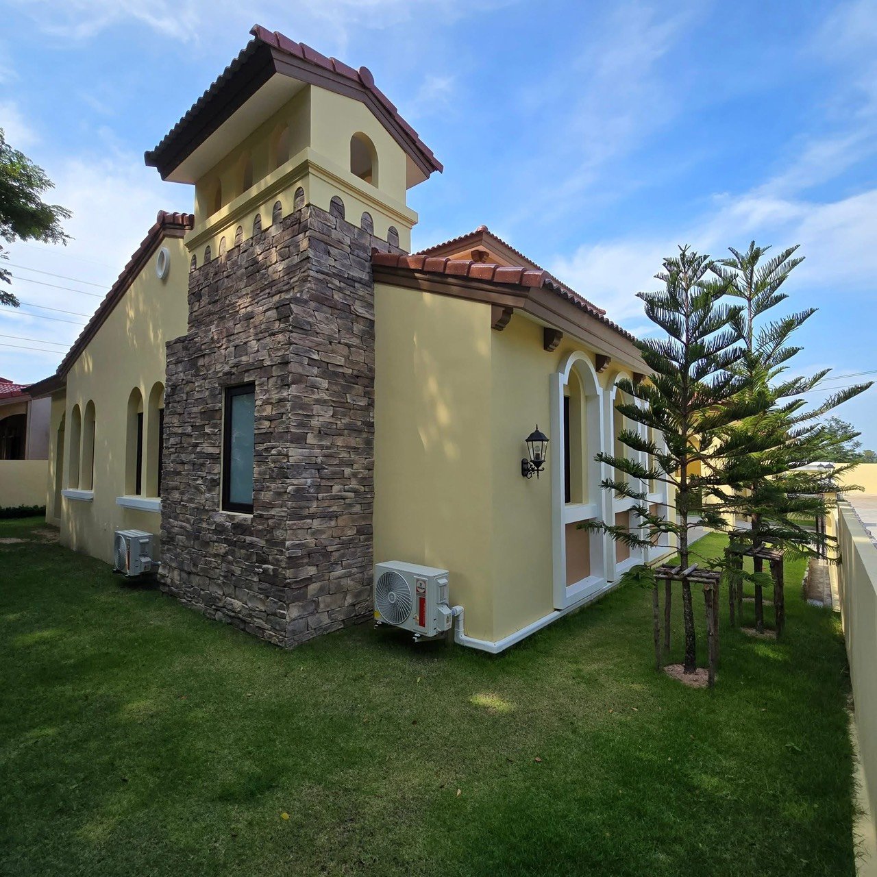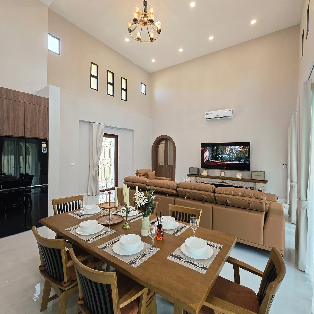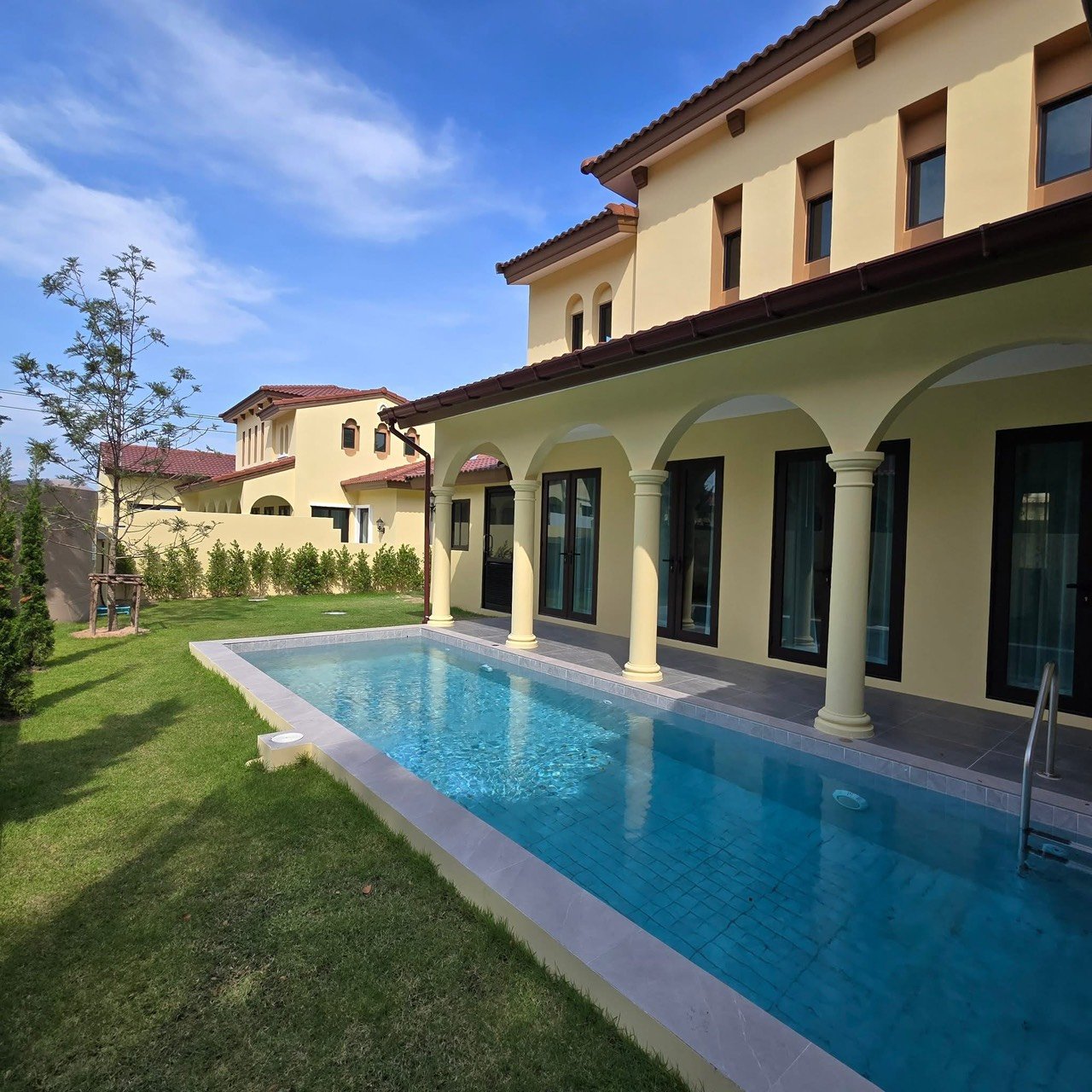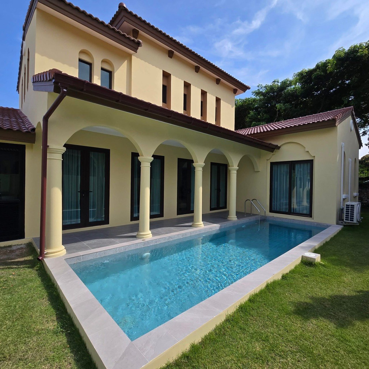 Chivani Pattaya pool villa, a luxurious Tuscan-style village nestled amidst lush trees, offering a Khao Yai atmosphere but close to the sea. Located on Sukhumvit Road, Good location, next to the main road, convenient for travel and close to many tourist attractions, 400 meters from Nong Nooch Tropical Botanical Garden and opposite Columbia Pictures Water Park. Land area: 118.6 sq wah. 3 bedrooms, 4 bathrooms. 100% new house, fully renovated. The design is simple and elegant and easy on the eyes. Asking selling price: 10.9 million baht or annual rental 65,000 baht less.