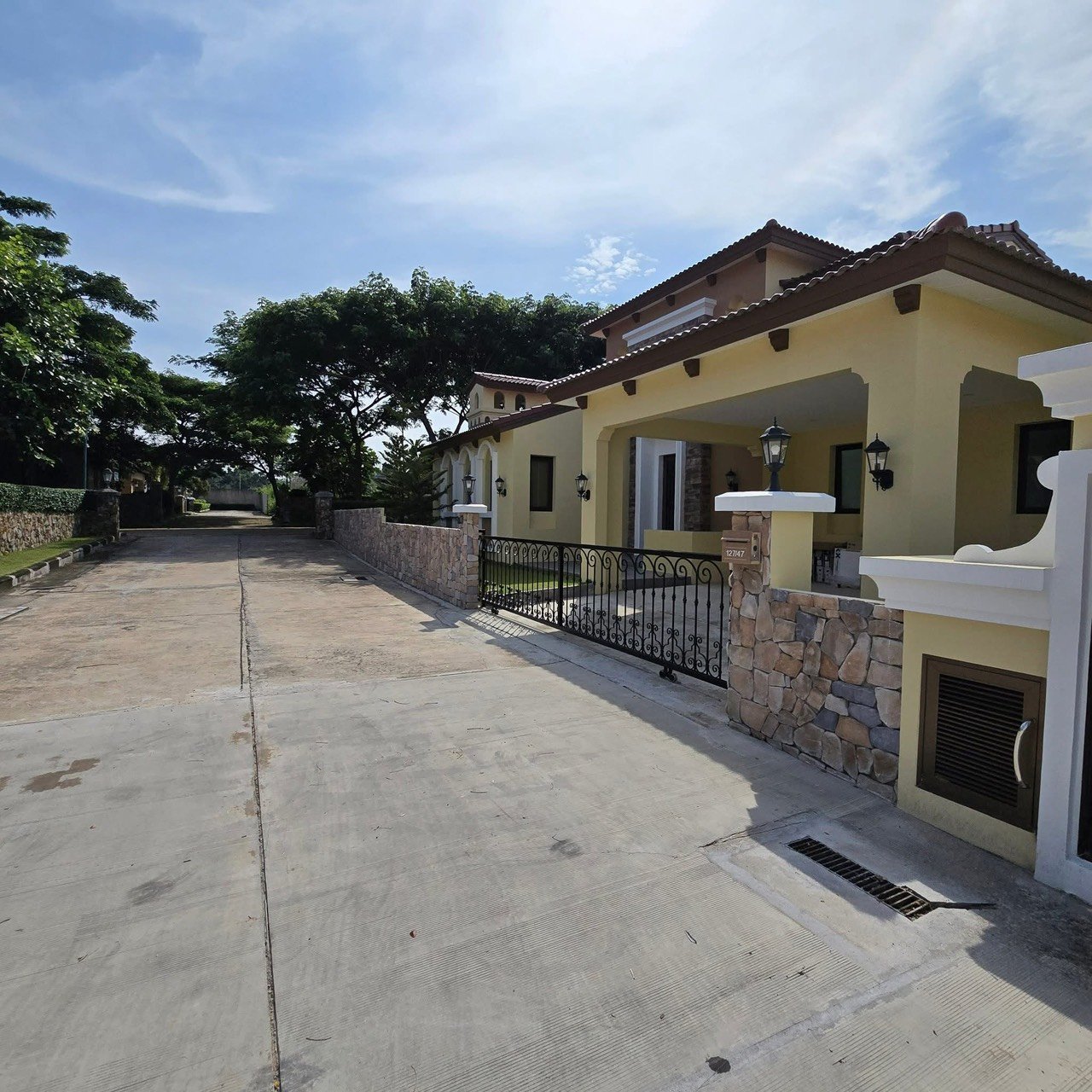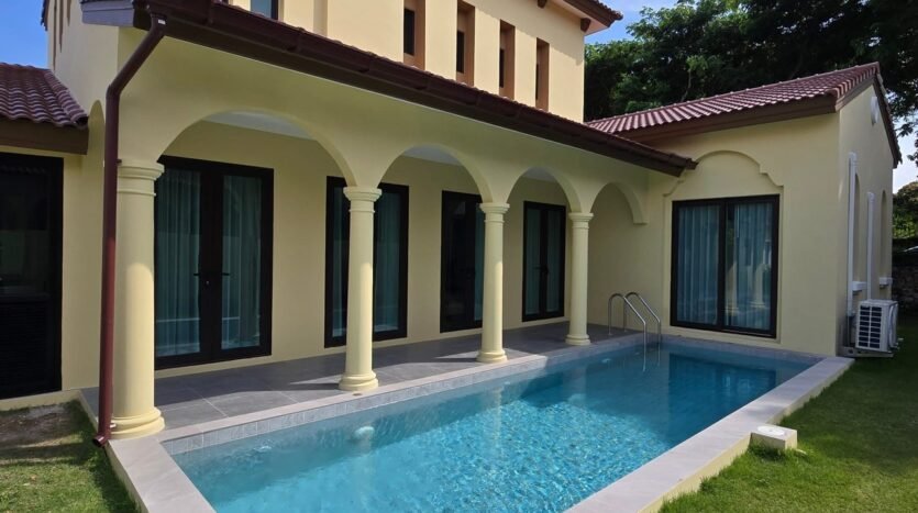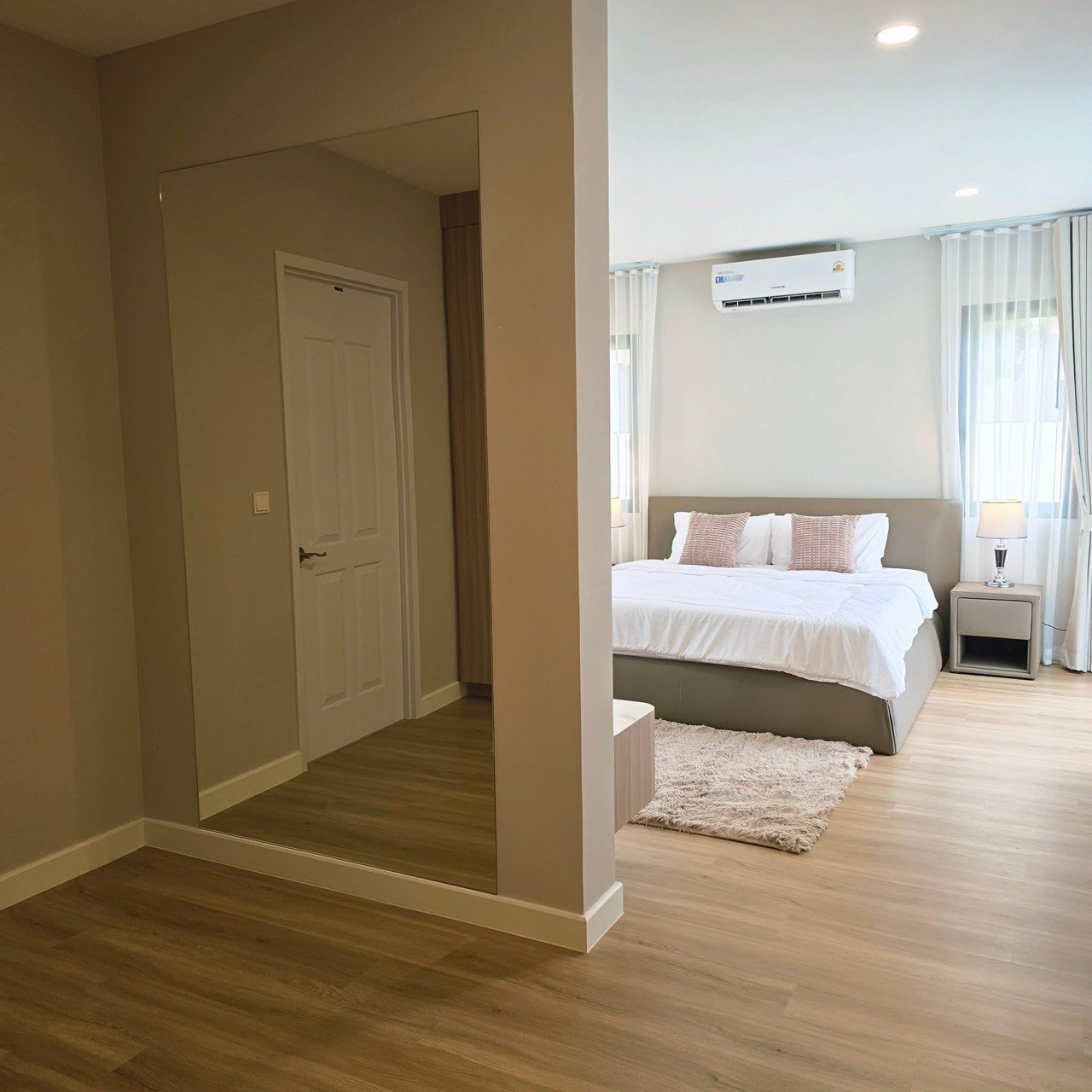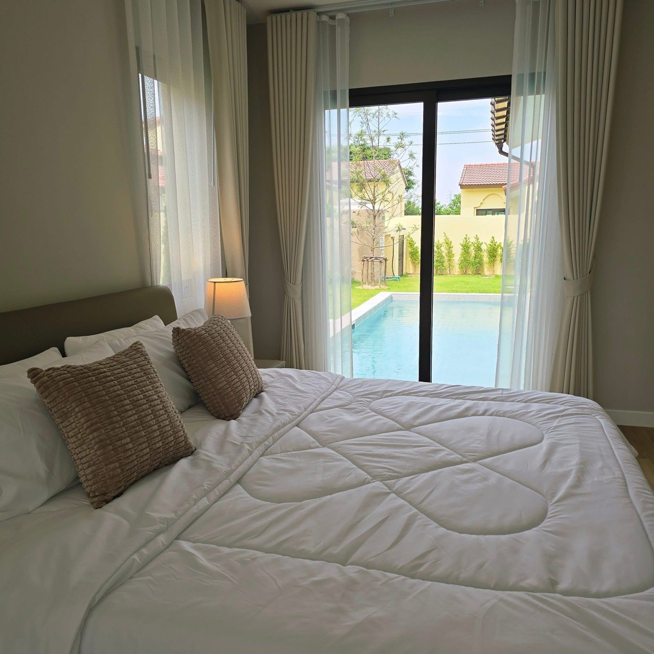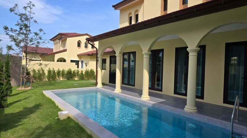 Chivani Pattaya pool villa, a luxurious Tuscan-style village nestled amidst lush trees, offering a Khao Yai atmosphere but close to the sea. Located on Sukhumvit Road, Good location, next to the main road, convenient for travel and close to many tourist attractions, 400 meters from Nong Nooch Tropical Botanical Garden and opposite Columbia Pictures Water Park. Land area: 118.6 sq wah. 3 bedrooms, 4 bathrooms. 100% new house, fully renovated. The design is simple and elegant and easy on the eyes. Asking selling price: 10.9 million baht or annual rental 65,000 baht less.