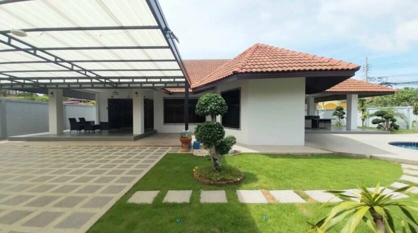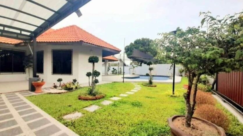 Small easy-to-keep garden laid to grass with covered carport for two cars and 3-4 bikes. Swimming pool has a 5 year warranty.